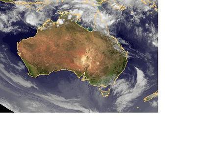 Auf dem Satellitenbild von Montag früh sind über Australien im Norden Schauer- oder Gewitterwolken zu erkennen. Hier fällt heute gebietsweise Regen. Sonst sind weite Teile des Kontinents unter Hochdruckeinfluss nahezu wolkenfrei.
