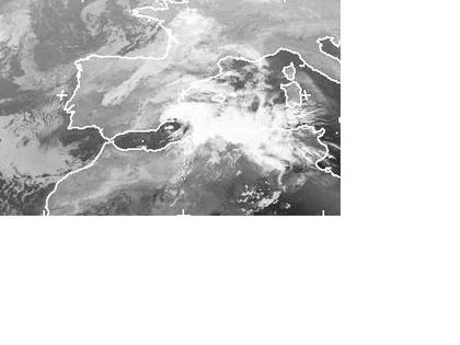 Ein kleines Tief sorgt von Nordalgerien bis zu den Balearen für dichte Wolken mit Schauern und Gewittern. Im Westen der iberischen Halbinsel bleibt es unter leichtem Hochdruckeinfluss dagegen meist freundlich mit nur wenigen Wolken. (Bildquelle: NERC Satellite Receiving Station, Dundee University, Scotland, http://www.sat.dundee.ac.uk/)