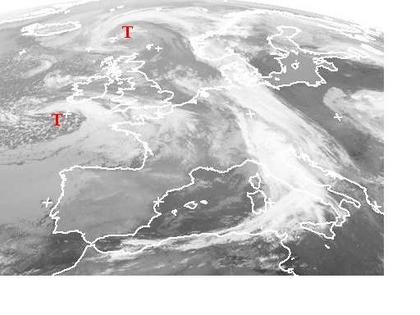 Die Kaltfront von Tief 'Zora' nördlich von Schottland erstrecken sich auf dem Satellitenbild von Dienstag früh von Südnorwegen über Deutschland bis nach Italien, und bringen teils kräftigen Regen. Westlich dieser Front sorgen weitere Wolken für teils unbeständiges Wetter. Westlich von Irland befindet sich bereits ein neues Tief, das in den kommenden Tagen Regen bringen wird. (Bildquelle: NERC Satellite Receiving Station, Dundee University, Scotland, http://www.sat.dundee.ac.uk/)