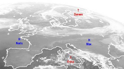 Auf dem Satellitenfoto zeigen sich von den Britischen Inseln bis in den Westen Russlands vielfach dichte Wolken und zwischendrin auch Auflockerungen. Hierbei regnet es zumeist nur leicht oder es bleibt den Tag über neblig-trüb. Weiter nach Süden von der Biskaya, über die Alpen bis zum Schwarzen Meer sorgen die Hochdruckgebiete 'Noris' und 'Max' für meist freundliches Herbstwetter, wobei sich auch hier teils längere Zeit Nebel halten kann. Im Mittelmeerraum bewirkt Tief 'Enna' bei Italien für einige Schauer und auch Gewitter. Am östlichen Mittelmeer ist es dagegen überwiegend heiter und teils wolkenlos.