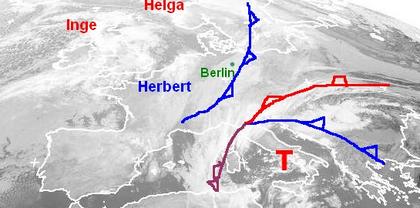 In weiten Teilen Europas überwiegt Tiefdruckeinfluss. Über Südostdeutschland liegt die Kaltfront von Tief „Helga“ bei Island, sie bringt heute etwas Regen zu uns. Über den Britischen Inseln halten sich mehrere Wolken, sie gehören dem Tief „Inge“ über dem Atlantik, zu Beginn der nächsten Woche ist das Tief auch in Mitteleuropa mit teils kräftigen Niederschlägen und stürmischem Wind zu erwarten. Ein weiteres Tief über dem Mittelmeer bringt Wolken und Regen von Italien bis zum Balkan. Das Zwischenhoch „Herbert“ über Benelux und Frankreich ist kaum zu erkennen.(Bildquelle: NERC Satellite Receiving Station, Dundee University, Scotland, http://www.sat.dundee.ac.uk/)