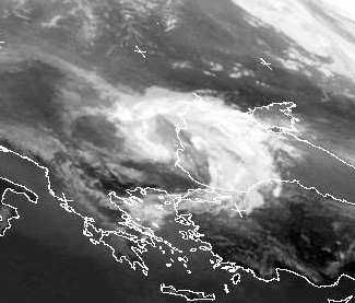 Der Ausschnitt zeigt ein kleines Tief über dem Schwarzen Meer, seine Kaltfront erstreckt sich spiralförmig von dem Tiefzentrum bis zum Ägäischen Meer. Heute und morgen sorgt es noch für teils kräftige Gewitter in der Region, danach zieht es nach Osten ab und löst sich dabei auf.
