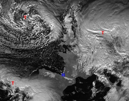 Während zwei Tiefdruckgebiete über dem Atlantik und ein weiteres über Norddeutschland dichte Wolken mit Regen oder Schnee, im Süden teils auch Gewitter bringen sorgt Hoch 'Gilma' mit seinem Zentrum über den Pyrenäen in Nordspanien und Westfrankreich für freundliches Wetter. Hier können sich nur wenige Wolken halten. Bis Morgen soll sich das Hoch weiter nach Osten verlagern und vor allem dem Süden Deutschlands etwas ruhigeres Wetter bringen.