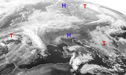 Auf dem Satellitenbild von Freitag Früh sind über der Biscaya, dem Balkan und Finnland Tiefdruckgebiete zu erkennen, die mit ihren Ausläufern verbreitet für Wolken und regen sorgen. Nur von Südfrankreich über die Alpen bis nach Tschechien, sowie über Schweden bringt Hochdruckeinfluss freundliches und meist trockenes Wetter.