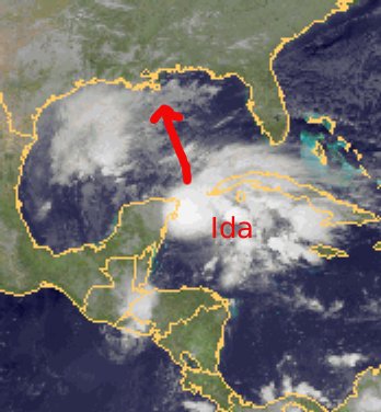 Der Hurrikan 'Ida' liegt am Sonntag noch über der Straße von Yucatan zwischen Mexiko und Kuba. Dabei erreicht er in Böen Windgeschwindigkeiten bis zu 190 km/h. Er zieht weiter nach Norden über den Golf von Mexiko hinweg und zieht am Montag rasch auf die Südküste der USA zu. Mit seinem Kern könnte er schon am Montagabend die Küste etwa im Bereich der Mississippimündung erreichen. Bedroht ist jedoch die gesamte Küste von Louisiana bis zum westlichen Florida. Durch den Sturm sind an der Küste auch Sturmfluten möglich. Zudem muss mit sehr kräftigen Regenfällen gerechnet werden.