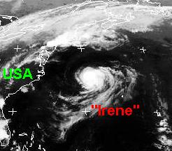 Der tropische Sturm 'Irene', der sich im westlichen Atlantik befindet hat sich zu einem Hurrikan entwickelt. Zur Zeit zieht er mit Windgeschwindigkeiten von 140, in Böen 170km/h in einiger Entfernung parallel zur ostamerikanischen Küste weiter nach Nordwesten, Berechnungen zufolge werden keine Inseln beeinflusst.