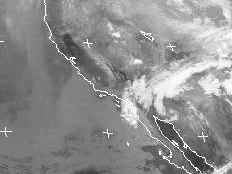 Das Tief über dem Südwesten der USA löst sich langsam auf. Es sind noch ein paar Wolkenfelder an der mexikanischen Grenze zu erkennen. Weiter nördlich haben sich die meisten Wolken schon unter zunehmendem Hochdruckeinfluss aufgelöst. Über dem Pazifik erkennt man jedoch schwach eine Hochnebeldecke, die sich auch auf die küstennahen Gebiete Südkaliforniens erstreckt.