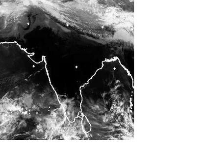 Auf dem Satellitenbild von Mittwoch früh sind Indien und die nördlicheren Regionen nahezu wolkenfrei. Gut zu erkennen ist auch der Verlauf des Himalayagebirges, dass sich mit seinen kühleren Temperaturen (im Infrarotbereich heller dargestellt) deutlich vom wärmeren Indien abhebt. (Bildquelle: NERC Satellite Receiving Station, Dundee University, Scotland, http://www.sat.dundee.ac.uk/)