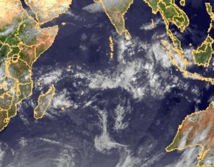 Auf dem Satellitenbild ist über dem Indischen Ozean an der konvektiven Bewölkung der Verlauf der innertropischen Konvergenzzone erkennbar. In ihrem Bereich treten kräftige Schauer und Gewitter auf.