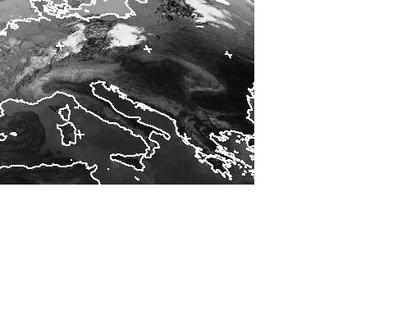 Während über Deutschland und Polen noch einige Wolken zu erkennen sind, ist der Himmel von Italien bis zum Schwarzen Meer unter Hochdruckeinfluss nahezu wolkenfrei. Dabei sind die Höhenzüge der Alpen, des Dinarischen Gebirges und der Karpaten gut zu erkennen, da sie deutlich kühler sind als ihre Umgebung. Kühlere Temperaturen werden im Infrarotbereich heller dargestellt. (Bildquelle: NERC Satellite Receiving Station, Dundee University, Scotland, http://www.sat.dundee.ac.uk/)
