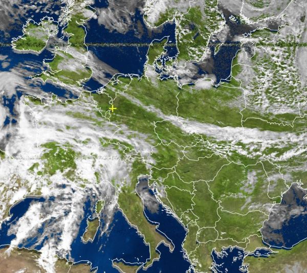 Auf dem Satellitenfoto vom heutigen Nachmittag erkennen wir die von West nach Ost sich erstreckende Kaltfront, in etwa über der Mitte Deutschlands. Südlich des schmalen Wolkenbands herrscht dabei verbreitet freundliches und frühsommerlich warmes Wetter, während nördlich der fast stationären Kaltfront die kalte Luft vom Nordmeer bereits eingesickert ist.