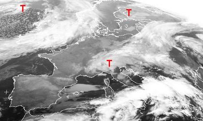 In einem schmalen Streifen von den Azoren bis ins Baltikum bleibt es unter leichtem Hochdruckeinfluss meist freundlich und trocken. Im Norden und Süden dieses Streifens halten sich Tiefdruckgebiete und sorgen für zum Teil kräftigen Regen, vereinzelt auch noch für Schnee.