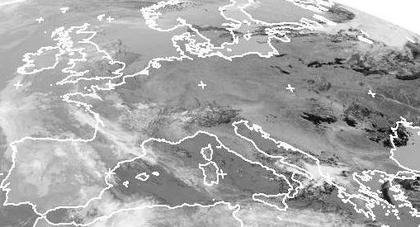 Weite Teile von Mitteleuropa sind unter Hochdruckeinfluss nahezu wolkenfrei. Leichter Tiefdruckeinfluss sorgt dagegen für Wolken und etwas Regen auf der Iberischen Halbinsel. Auch über Südwestfrankreich und Süditalien sind einige Wolken zu erkennen, hier fallen allerdings örtlich Schauer oder Gewitter. (Bildquelle: NERC Satellite Receiving Station, Dundee University, Scotland, http://www.sat.dundee.ac.uk/)