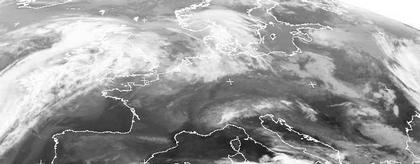 Während das Hoch 'Sandra' für viel Sonnenschein in weiten Teilen Mittel- und Osteuropas sorgt, bringt das Atlantiktief 'Nick' Regenwolken nach Nordwesten. Auf dem Satellitenbild vom Donnerstagmorgen erstreckt sich die Warmfront des Tiefs von Schottland bis nach Südskandinavien und Norddeutschland, seine Kaltfront liegt über Irland und dem östlichen Atlantik, in der Nacht zu Samstag wird sie auch in Deutschland erwartet und kann kräftigen und gewittrigen Regen bringen. Einzelne Haufenwolken sind sich über dem Balkan und den Alpen zu erkennen, hier entwickeln sich lokale Wärmegewitter.