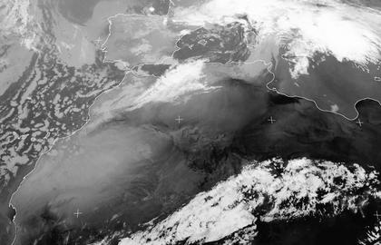 Der Ausschnitt zeigt ein Wolken- und Regenband über dem algerischen Atlasgebirge. Er gehört einem Ausläufer von Tief 'Bernd' über Mitteleuropa, das hier teils kräftige Niederschläge bringt, heute und morgen sorgt er auch in Nordafrika für Regen.
