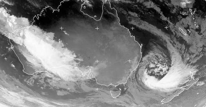 Weite Teile Australiens sind sind unter Hochdruckeinfluss wolkenarm. Über Westaustralien erkennt man jedoch die Wolken eines Höhentiefs, das verbreitet Regen bringt. Vor der Nordinsel Neuseelands ist ein weiteres Tief in schöner Wirbelform zu erkennen, das morgen auf der Insel starke Regenfälle bringen wird.