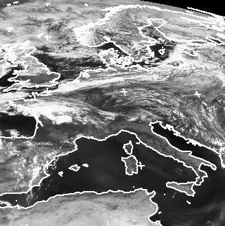 Auf dem Satellitenbild vom Sonntagmittag erkennt man ein schmales Wolkenband, das sich von Belgien bis etwa zum Berliner Raum erstreckt. Es sind die Reste der Bewölkung einer Kaltfront von Tief 'Rüdiger' über Nordosteuropa. Sie hat sich jedoch unter dem Einfluss von Hoch 'Iris' schon stark abgeschwächt. Regen bringt sie kaum noch. Dennoch wird auf ihrer Rückseite von Nordwesten kühlere Luft nach Deutschland gelenkt. Später können auch wieder mehr Wolken, die bereits über der Nordsee liegen, nach Norddeutschland ziehen. In weiten Teilen Mitteleuropas findet man aber bisher nur ein paar lockere Quellwolken. (Bildquelle: NERC Satellite Receiving Station, Dundee University, Scotland, http://www.sat.dundee.ac.uk/)
