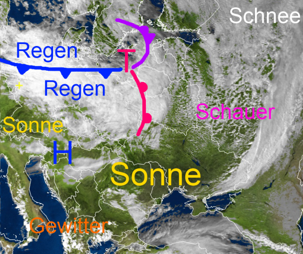 Die Wolken eines Tiefs über der Ostsee bedecken die Nordhälfte Deutschlands und sorgen für Regen und Sprühregen. Im Süden scheint hingegen noch vielfach die Sonne.