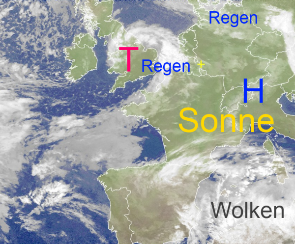 Der Wolkenwirbel eines Tiefs über England zieht heute mit teils schauerartigen Regenfällen über den Norden und die Mitte unseres Landes. Der Wind frischt dabei böig auf. Im Süden scheint längere Zeit die Sonne, wobei es in der Regel auch trocken bleibt.