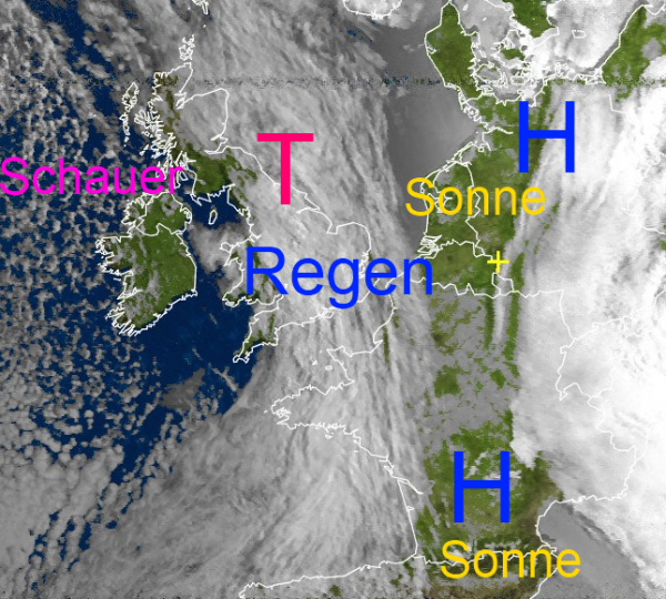 Zwischen zwei Wolkengebieten hat sich ein freundlicher Streifen gebildet. Davon profitiert vor allem der Nordwesten unseres Landes mit reichlich Sonnenschein. Die Regenwolken bei den Britischen - Inseln schwächen sich vor unserer Haustür ab. Aus den dichteren Wolken im Osten und Südosten kann es im Tagesverlauf jedoch anfangen zu tröpfeln.