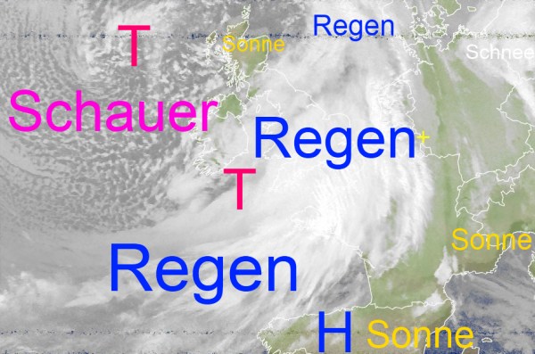 Über Westeuropa hat sich ein mächtiger Tiefdruckwirbel gebildet. In seinem Vorfeld schaufelt er recht milde Mittelmeerluft nach Norden, auf seiner Rückseite strömt polare Kaltluft weit nach Süden, zu erkennen an der schuppenförmigen Schauerbewölkung über dem Atlantik. Seine breite Wolkenzone bringt den Britischen - Inseln, Nordwestfrankreich, sowie den Benelux-Staaten reichlich Regen. Die Wolken scheren auch in den Westen Deutschlands aus und bringen vor allem in der Nacht Regen, in den westdeutschen Mittelgebirgen kann es auch schneien.