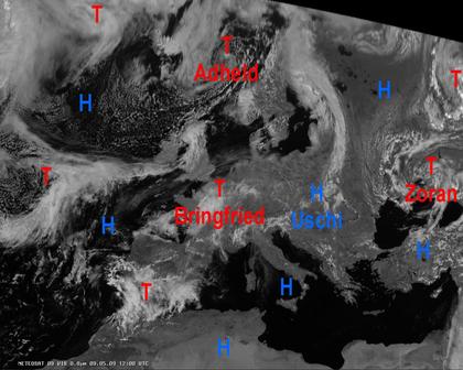 Auf dem heutigen Satellitenbild sind über der Iberischen Halbinsel und über Frankreich Tiefdruckgebiete zu erkennen, die dort für einzelne Schauer und örtlich auch Gewitter sorgen können. Tiefdruckeinfluss mit dichten Wolken und Schauern herrscht weiterhin über einem Großteil der Britischen Inseln und über Skandinavien. Auch im Bereich des Schwarzen Meeres kommt es zu Schauern oder Gewittern. Sonst ist es in Europa aber überwiegend freundlich und trocken. Am sonnigsten ist es dabei im Mittelmeerraum.