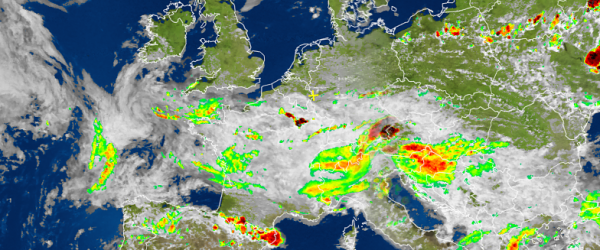 An der Grenze zur Schweiz und zu Österreich gibt es zur Zeit starken Regen und in Bayern auch noch heftige Gewitter. Sie sind sehr schön im Satbild zu erkennen. Weitere Gewitterzellen sind über dem Balkan und den Alpen zu sehen. Der Hochdruckeinfluss über Groß-Britannien und Norddeutschland ist überdeutlich. Mehr Wetter gibt es hier.