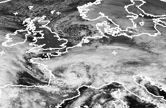 Auf dem Satellitenbild erkennt man zwei Tiefdruckwirbel, die das Wetter in Deutschland bestimmen. Über der Nordsee liegt das Tief 'Semjon II', das meist nur lockere Schauerwolken bringt. Vielmehr hat es trockene Luft von Südwesten nach Norddeutschland gebracht, wo es teils nur gering bewölkt ist. Über Frankreich liegt dagegen Tief 'Teruaki', das ein dichtes Wolkenband, teils mit Regen oder Schnee in den Süden und die Mitte des Landes bringt. (Bildquelle: NERC Satellite Receiving Station, Dundee University, Scotland, http://www.sat.dundee.ac.uk/)