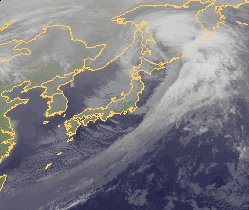 Ein Sturmtief liegt über dem Ochotskischen Meer, nördlich von Japan. Seine langgezogene Kaltfront liegt bereits über dem Pazifik. Auf ihrer Rückseite strömt von Sibirien kalte Luft nach Süden. Dabei bilden sich über dem Japanischen Meer Schauerwolken, die vor allem auf der Nordostseite der japanischen Inseln Schneefälle bringen.