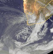 Südlich vom Kap der Guten Hoffnung, über dem Südpolarmeer liegt ein kräftiges Sturmtief. Seine Ausläufer ziehen von Westen über Südafrika hinweg. Es kommt zu kräftigem Wind und teils Regen. Dabei lenkt das Tief von Südwesten auch kalte Luft heran. Vor allem über dem Meer zeigen sich die aufgelockerten Wolken von Schauern und Gewittern, die sich in der Kaltluft bilden.