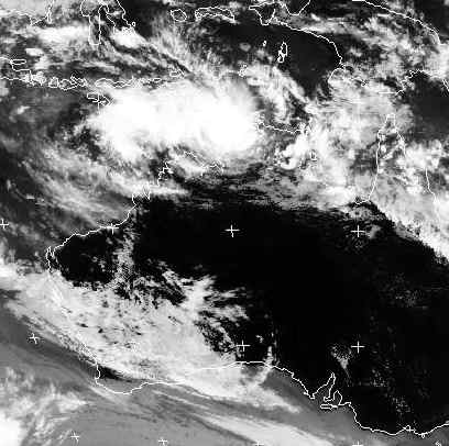 Das Satellitenbild zeigt Taifun 'Ingrid' über dem Timorsee bei Australien. Seit gestern hat er sich etwas abgeschwächt, seine Windgeschwindigkeit beträgt zur Zeit 185, in Böen 230 km/h. Nach den neuesten Berechnungen überquert er heute den Josef-Bonapart Golf und erreicht morgen Kap Londonderry, in Böen werden immer noch bis zu 185 km/h erwartet.