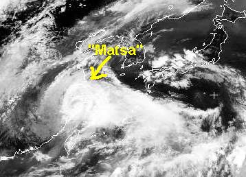 Der Taifun 'Matsa' ist heute mit Windgeschwindigkeiten von 140, in Böen bis 170 km/h auf die chinesische Küste südlich von Shanghai getroffen, er zieht ins Landesinnere und schwächt sich dabei schnell ab.