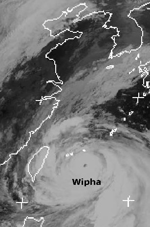 Über dem Pazifik, westlich von Taiwan, liegt am Montagabend der Taifun 'Wipha' mit Windgeschwindigkeiten bis 165 km/h, in Böen auch bis 205 km/h. Auch auf Taiwan kommt es zu Orkanböen und kräftigem Regen. Er zieht weiter nach Nordwesten und erreicht in der Nacht zu Dienstag die Küste des chinesischen Festlands. Er zieht dann voraussichtlich entlang der Küste nach Norden. (Bildquelle: NERC Satellite Receiving Station, Dundee University, Scotland, http://www.sat.dundee.ac.uk/)