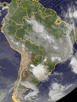 Auf dem heutigen Satellitenfoto zeigt sich Südamerika meist heiter, häufig auch wolkenlos. Über dem Nordosten Argentieniens befindet sich ein ausgeprägtes Tiefdruckgebiet, das dort für verbreitet kräftige Schauer und Gewitter mit häufig ergiebigem Regen sorgt. Auch sonst kommt es vor allem über Brasilien zu teils kräftigen Gewittern.