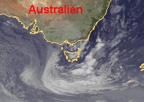 Auf dem Bildausschnitt vom südöstlichen Teil Australiens sind von Tasmanien bis zur südlichsten Küste des Kontinents teils dichte Wolken zu erkennen. Hierbei kommt es gebietsweise zu kräftigem und ergiebigem Regen, teils auch in Form einzelner Gewitter.