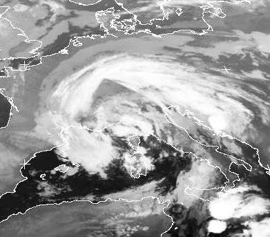 Tief 'Boris' mit Kern über dem Golf von Genua prägt mit seiner Wolkenspirale das Wetter zwischen Nordafrika und Deutschland. Über dem Mittelmeer kommt es dabei auch zu Gewittern. In Norddeutschland bestimmt Hoch 'Oldenburgia' das Wetter. Allerdings erkennt man im Landesinneren auch eine tiefe Wolkendecke, die sich nur langsam auflöst.