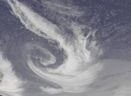 Auf dem Satellitenbild ist ein Tiefdruckgebiet im Südatlantik in der Nähe der Bouvet-Insel zu sehen. Dieses wird im Uhrzeigersinn im Gegensatz zu den Tiefdruckgebieten auf der Nordhalbkugel umströmt.