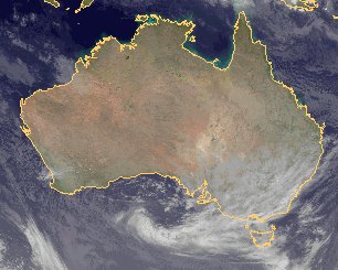 Ein Sturmtief liegt über der Großen Australischen Bucht im Süden des Kontinents. Der Wolkenschirm seiner Ausläufer überzieht weite Teile des Südostens Australiens. Zu Regen kommt es aber meist nur an der Küste. Weiter nach Norden findet man über dem Kontinent kaum noch Wolken.
