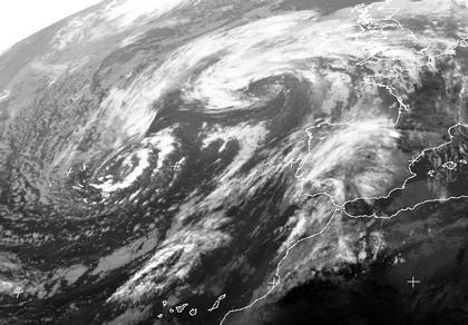 Der Ausschnitt zeigt einen Tiefdruck-Komplex auf dem Atlantik. Schon zu erkennen ist der Unterschied zwischen dem steuernden Tief süwestlich von Irland, das den charakteristischen Wolkenschirm hat der in warmer Tropenluft entsthet. Dagegen ist das kleine Tief südwestlich eher ein Strömungswirbel in der kälteren Polarluft und der Wolkenschirm fehlt. Dafür entstehen zum Teil kräftige Gewitter, die sich hellweiß aus der umgebenden Menge flacherer Quellwolken abheben.