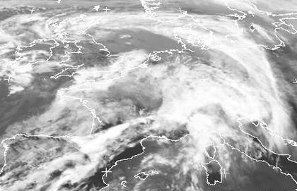 Das zentrumk von Tief 'Karin' über den Bri5tischen Inseln lenkt mit einer südwetslichen Strömung seine Ausläufer mit Wolken und viel Regen nach Mitteleuropa. Über Norddeutschland erkennt man ein aufgelockertes Gebiet, im Süden halten sich die dichten Regenwolken.