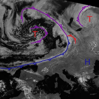 Tief 'Peter' mit Zentrum zwischen Island und den Britischen Inseln hat mit seinen Ausläufer Skandinavien und Mitteleuropa erreicht. Okklusion und Warmfront liegen dabei von Island bis nach Skandinavien, die Kaltfront erstreckt sich mit ihrer Bewölkung dabei Südskandinavien bis nach Nordfrankreich und auf den Atlantik hinaus. Eine weitere Okklusion zieht mit Schauern über den Norden der Britischen Inseln hinweg und erreicht bis morgen auch Deutschland. Hochdruckeinfluss herrscht dagegen an vielen Teilen des Mittelmeers und in Südosteuropa. Einige Gewitterzellen sind aber in Griechenland und Albanien auszumachen.