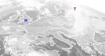 Auf dem Satellitenbild von Samstag früh erstreckt sich ein dichtes Wolkenband von Russland über die Baltischen Staaten und Weißrussland bis zum Balkan. Es ist die Kaltfront des Tiefs 'Roland' mit Zentrum über Russland, die hier noch für Schneeschauer sorgt. Sonst bringt ein Hoch mit Kern über England ruhiges, teils freundliches, teils auch trübes Wetter. (Bildquelle: NERC Satellite Receiving Station, Dundee University, Scotland, http://www.sat.dundee.ac.uk/)