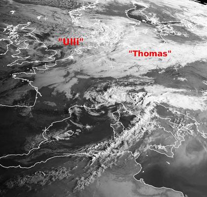 Binnen 24 Stunden sind zwei Tiefdruckgebiete mit Regen über Mitteleuropa gezogen. Sie zeigen sich im Satellitenbild von Donnerstag früh in dichter Bewölkung von Tief 'Thomas' über Polen und von Tief 'Ulli' über der Nordsee. Auch über Norditalien über den Süden Sardiniens bis auf den afrikanischen Kontinent sowie über Teilen Südosteuropas liegen Wolken, die zu einem weiteren Tiefdruckgebiet gehören. Sie bringen hier Schauer oder Gewitter. (Bildquelle: NERC Satellite Receiving Station, Dundee University, Scotland, http://www.sat.dundee.ac.uk/)