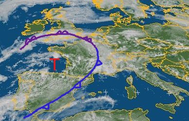 Ein Tiefdrucksystem mit Zentrum über der Biskaya erstreckt sich heute Mittag mit seinen Wolken vom südlichen Großbritannien über Ostfrankreich nach Südostspanien. Auf der Vorderseite strömt aus Südwesten feucht-warme Luft nach Mitteleuropa und Deutschland, so dass sich Schauer und Gewitter entwickeln können. Im Norden Deutschlands ist es aber teils noch wolkenarm. Das Tief wandert mit seinem Ausläufer langsam nach Osten weiter und beendet damit das sehr sonnige Wetter der letzten Tage über Mitteleuropa. (Bildquelle: Copyrigt EUMETSAT, NERC Satellite Receiving Station, University of Dundee)