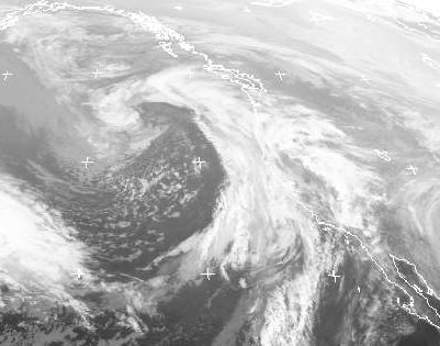 Auf dem Pazifik liegt ein Tiefdruckwirbel. Während es auf seiner Westseite in der nach Süden strömenden Kaltluft nur zu einzelnen Schauerwolken kommt, bringt er ein dichtes Wolkenband an die Küste von British Columbia bis Kalifornien. Es bringt teils kräftigen Regen. (Bildquelle: NERC Satellite Receiving Station, Dundee University, Scotland, http://www.sat.dundee.ac.uk/)