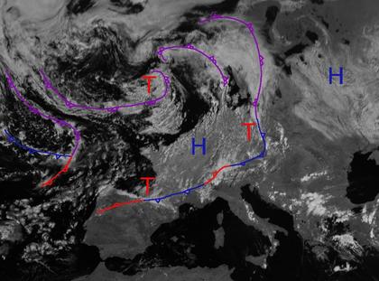 Eine Kette von Tiefausläufern mit einigen Wolken erstreckt sich heute Mittag von den Britischen Inseln bis nach Skandinavien. Von Skandinavien ausgehend nach Süden liegt ein weiteres Frontensystem mit vielen Wolken. Ebenso findet sich über dem Atlantik ein Tiefdruckgebiet. Zwischen diesen Wolken hat sich in Mitteleuropa Zwischenhocheinfluss durchgesetzt, sodass hier die Sonne häufiger scheint. Allerdings haben sich in feuchter Luft öfter Quellwolken mit einzelnen Schauern gebildet. Mehr Sonnenschein gibt es dagegen am Mittelmeer.
