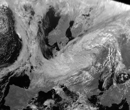 Auf dem heutigen Satellitenfoto ist ein ein breites Wolkenband von Nordwest- über Mittel- bis nach Ost- und Nordosteuropa zu sehen. Unter diesen vielfach dichten Wolken herrscht meist trübes oder nasses Wetter mit zum Teil anhaltendem Regen. Freundlicher ist es unter Hochdruckeinfluss über weiten Teilen Skandinaviens und zum größten Teil im südlichen Europa.