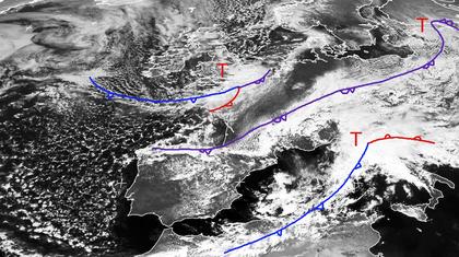 Während die Okklusion von Tief 'Melli' mit Zentrum über dem Baltikum am Sonntag Mittag noch Wolken bis nach Nordspanien bringt, stellt sich noröstlich davon leichter Zwischenhocheinfluss ein, so dass die Bewölkung geringer ist. Über den Britischen Inseln formiert sich aber schon Tief 'Olinde' und greift morgen nach Mitteleuropa über, wo es dann zu Schnee und Regen kommt. Nordwestlich des Tiefs erkennt man viele Schauerzelle. Auch über dem zentralen Mittelmeer bringt Tief 'Nanni' dichte Wolken und Regen sowie Schauer und kühle Luft bis auf den nördlichen afrikanischen Kontinent. (Bildquelle: NERC Satellite Receiving Station, Dundee University, Scotland, http://www.sat.dundee.ac.uk/)