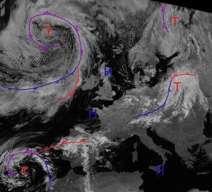 Tiefdruckgebiete sorgen heute für Wolken über vielen Teilen Europas. So liegt Tief 'Odin' mit seinen Ausläufer von den Alpen bis zum Baltikum und Tief 'Martin' über Skandinavien. Auch im Südwesten sorgt ein Tief für Regen- oder Gewitterwolken. Auf dem Atlantik zeigt sich bereits Tief 'Peter', dessen Ausläufer Deutschland am Donnerstag erreichen. Hochdruckeinfluss bringt dagegen wolkenarmes Wetter über den Britischen Inseln und vor allem am zentralen und östlichen Mittelmeer.