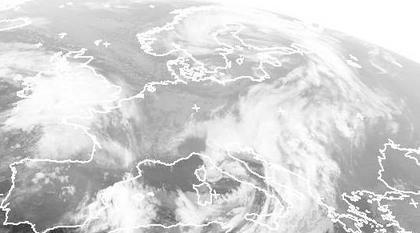 Auf dem Satelittenbild von heute Mittag 13 MEZ erkennt man größere Wolkencluster vor allem über den Britischen Inseln und Skandinavien, hier sorgen insgesamt 3 kräftige Tiefdrucksysteme für permanent starke Bewölkung und ergiebige Niederschläge mit Folge örtlicher Überschwemmungen speziell an kleinen und mittleren Flussläufen.